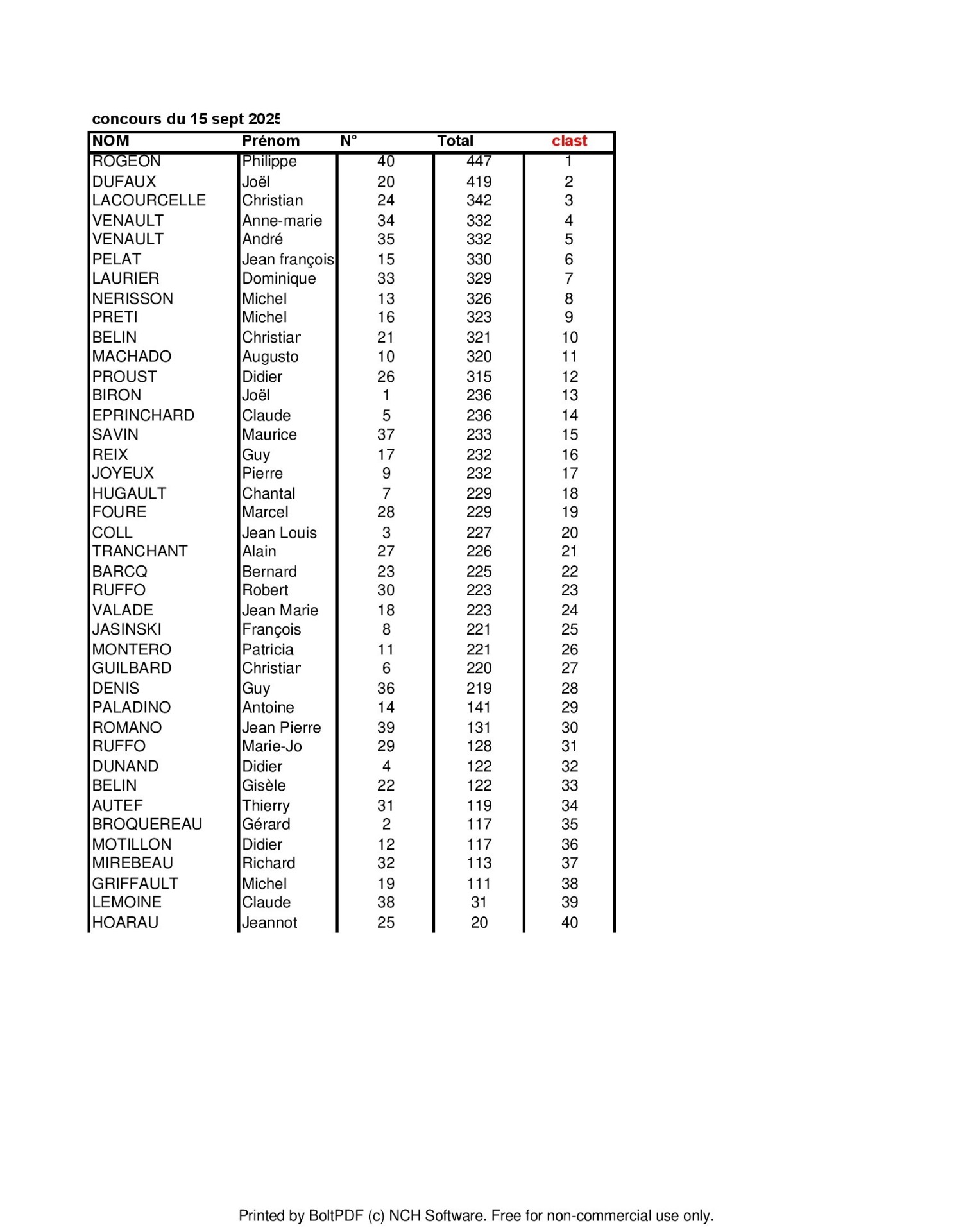 Gisèle à été primée comme 1ère féminine et nous retrouvons Augusto; Christophe, Alain, Christian l, et joêl B, aux 5 premières places.