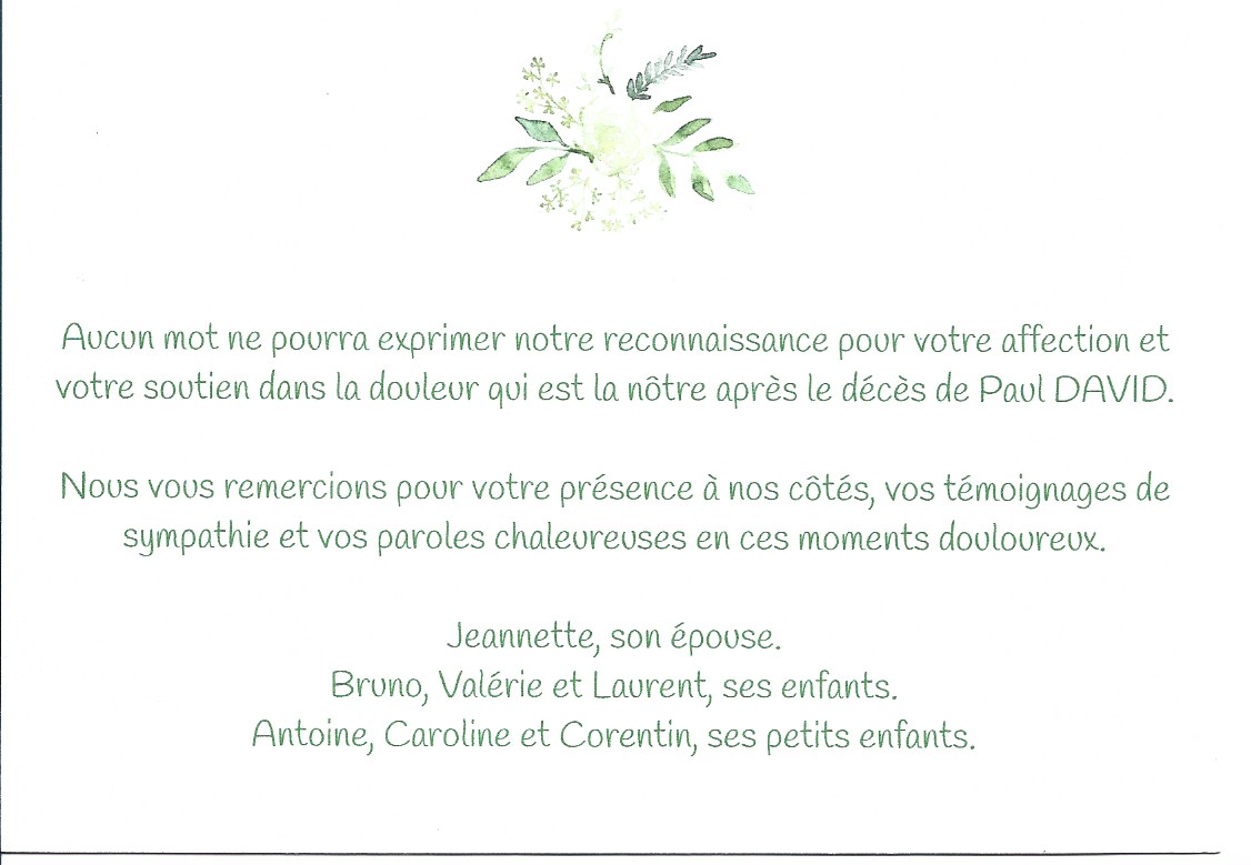 Remerciements de la famille de Jean Paul David, ci contre.